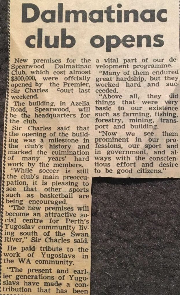 Article from unknown newspaper Opening of the Spearwood Dalmatinac Soccer Club premises 1978, Spearwood Courtesy of Dalmatinac Sport and Community Club