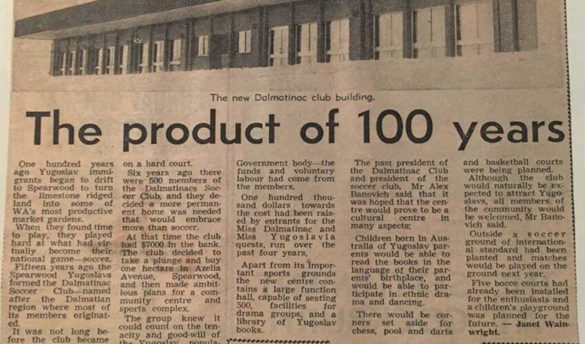News article, unknown author History of the Spearwood Dalmatinac Soccer Club No date, Spearwood Courtesy of Dalmatinac Sport and Community Club